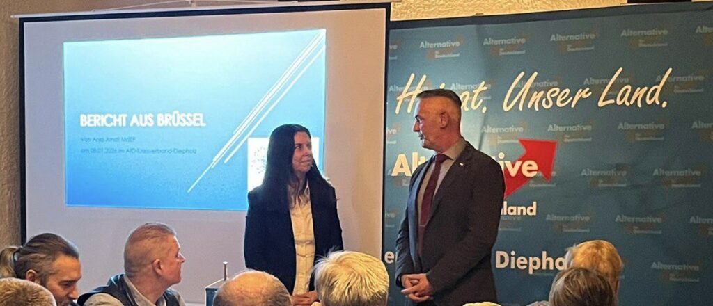 Als Gast begrüßte der Kreisverband Anja Arndt, die seit 2024 Abgeordnete des Europäischen Parlamentes ist. Die Mutter von 4 Kindern und studierte Sozialwissenschaftlerin hat in Brüssel ihren Schwerpunkt auf die Themen Umwelt, Klima und Lebensmittelsicherheit gelegt. Sie berichtete von der Gründung einer Fraktion der Souveränen Nationen (ESN) im Europäischen Parlament. „Mein Eindruck ist, dass die konservativen Parteien auf dem Vormarsch sind“, so Arendt in ihrer Rede. Besonders beschäftigte sie im Moment das Abkommen zur Begrenzung der Abgasemissionen, welches im November diesen Jahres in Kraft treten soll. Diese und andere Verordnungen aus dem Europaparlament hätten direkte Auswirkungen auf die Automobilbranche in ganz Deutschland. Betroffen seien auch im Landkreis ansässige Zuliefererbetriebe, wie zum Beispiel ZF, die den Abbau von 14000 Stellen angekündigt hätten. Da mittlerweile 80 Prozent aller Gesetze aus Brüssel kämen, teilte auch Anja Arndt die Hoffnung auf eine starke Mannschaft der Alternative für Deutschland in diesem wichtigen Gremium. In einer anschließenden Diskussionsrunde wurden noch weitere Themen angesprochen, die sich um Außen- und Sicherheitspolitik, Binnenmarkt und den Erhalt der kulturellen Identitäten der europäischen Nationen drehten. Im weiteren Verlauf des Abends ließen sich die Gäste das kalte Buffett schmecken und zwei weitere neue Mitglieder wurden aufgenommen. Die Alternative für Deutschland im Landkreis Diepholz freut sich auf das bevorstehende Jahr und auf einen spannenden und fairen Wahlkampf.